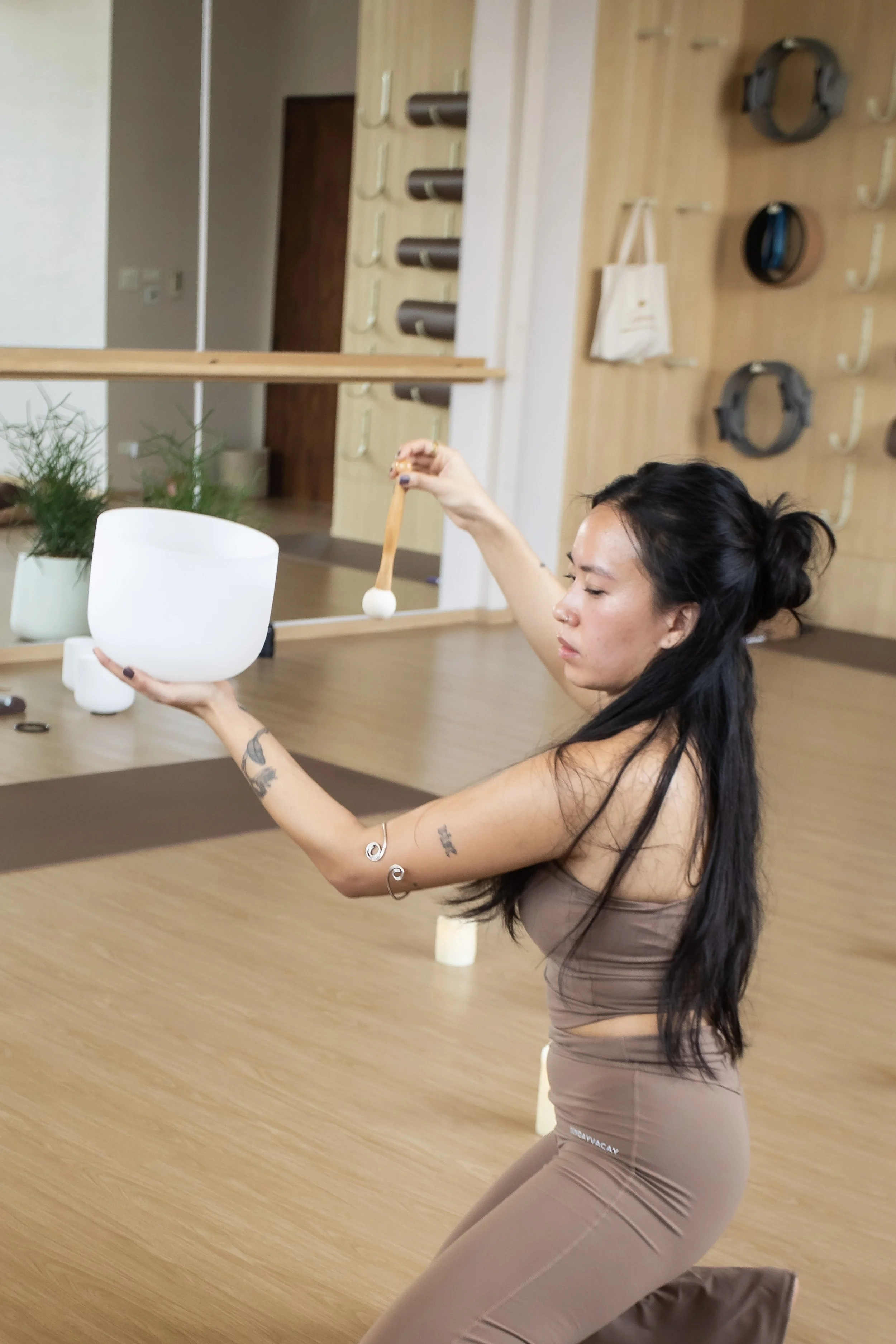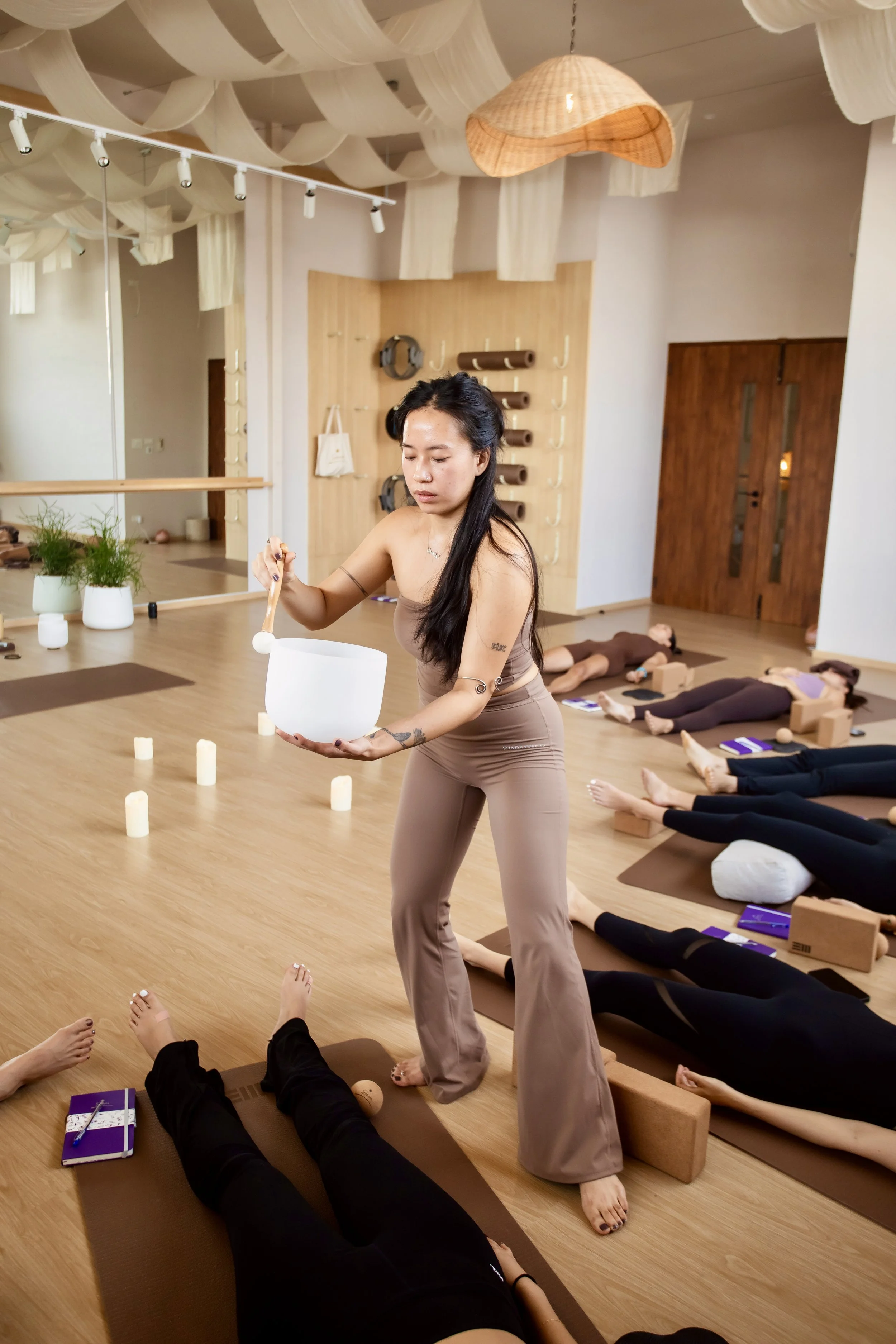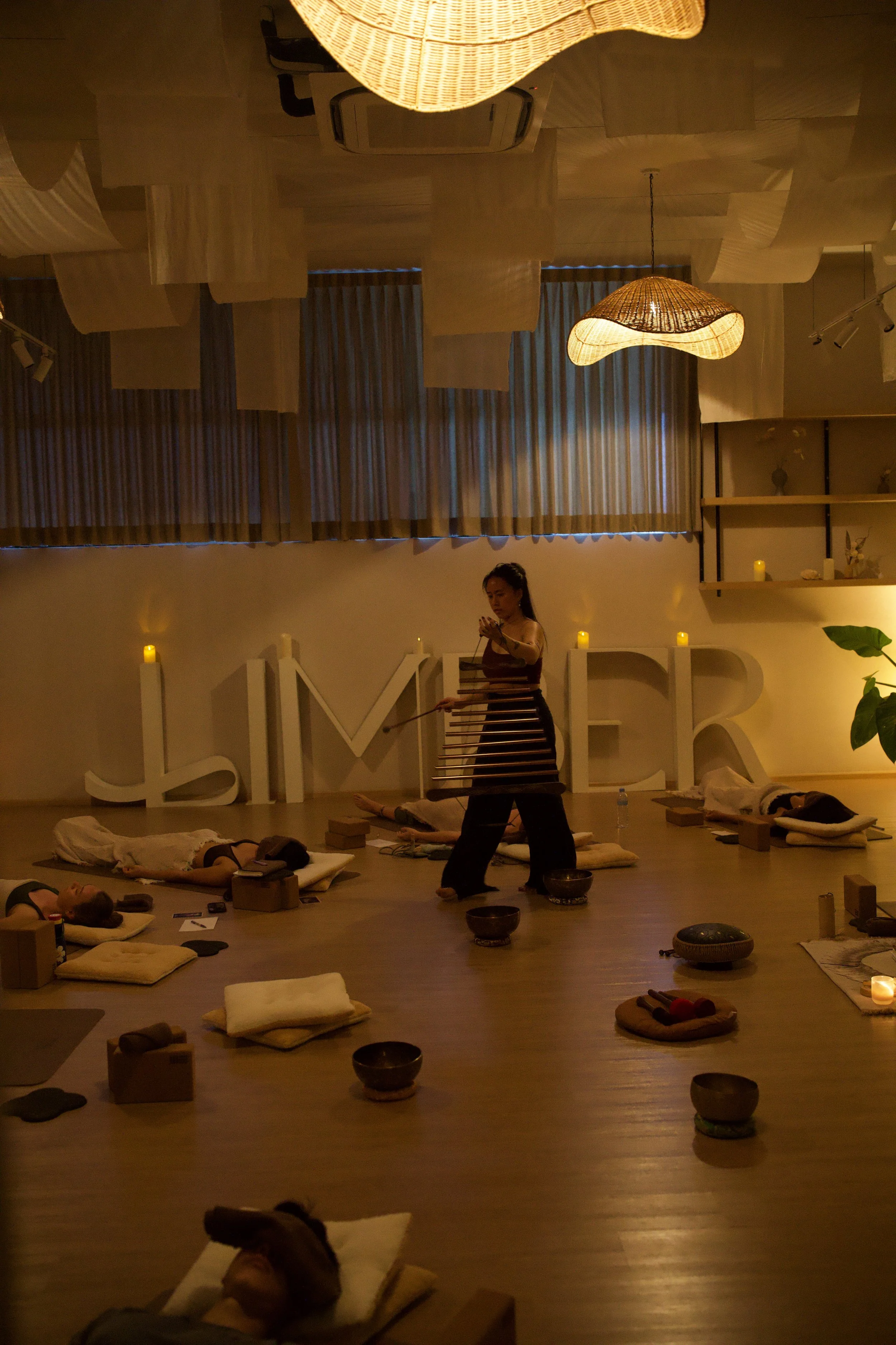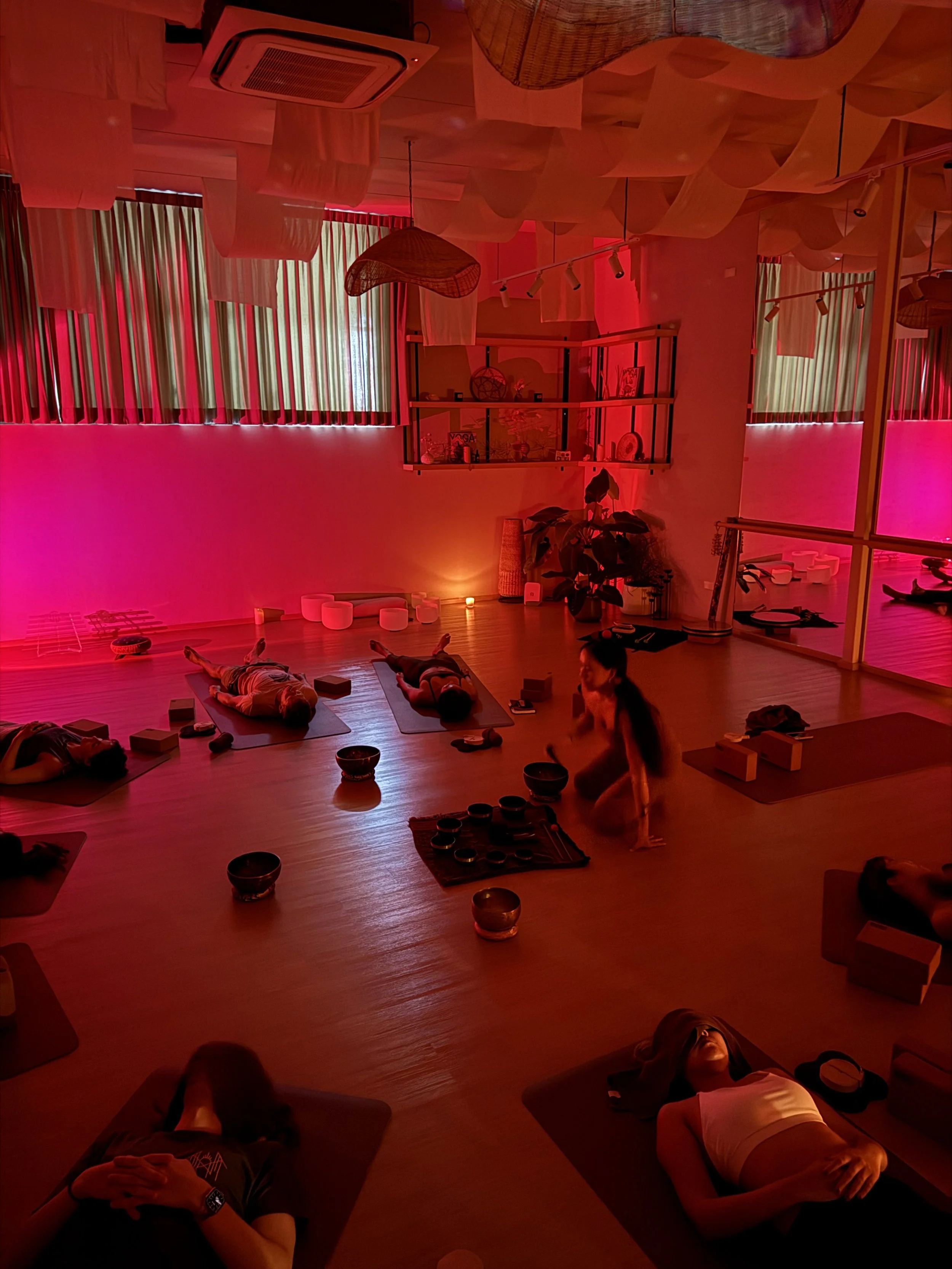 In a comfortable position (usually face- up with comfy props placed on / underneath them), the receivers lay silently with intentions to surrender to the varying sounds of mystifying instruments.
